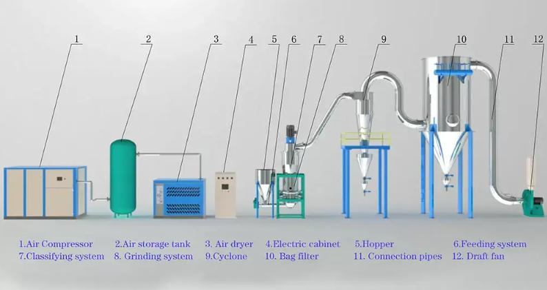 এলএইচএল জেট মিলটি কম্প্রেসড এয়ার ব্যবহার করে যা হিমশীতল, ফিল্টার এবং শুকনো হয় একটি সুপারসোনিক বায়ু প্রবাহ গঠনের জন্য যা পেষণকারী চেম্বারে ইনজেক্ট করা হয়, উপাদানটি তরলীকরণ করে।ত্বরিত কণা একাধিক নল বায়ু প্রবাহের ছেদনে সংঘর্ষ, গুরুতর সংঘর্ষ, ঘর্ষণ এবং কাটিয়া বাহিনীর মাধ্যমে অতি সূক্ষ্ম পেষণ অর্জন।